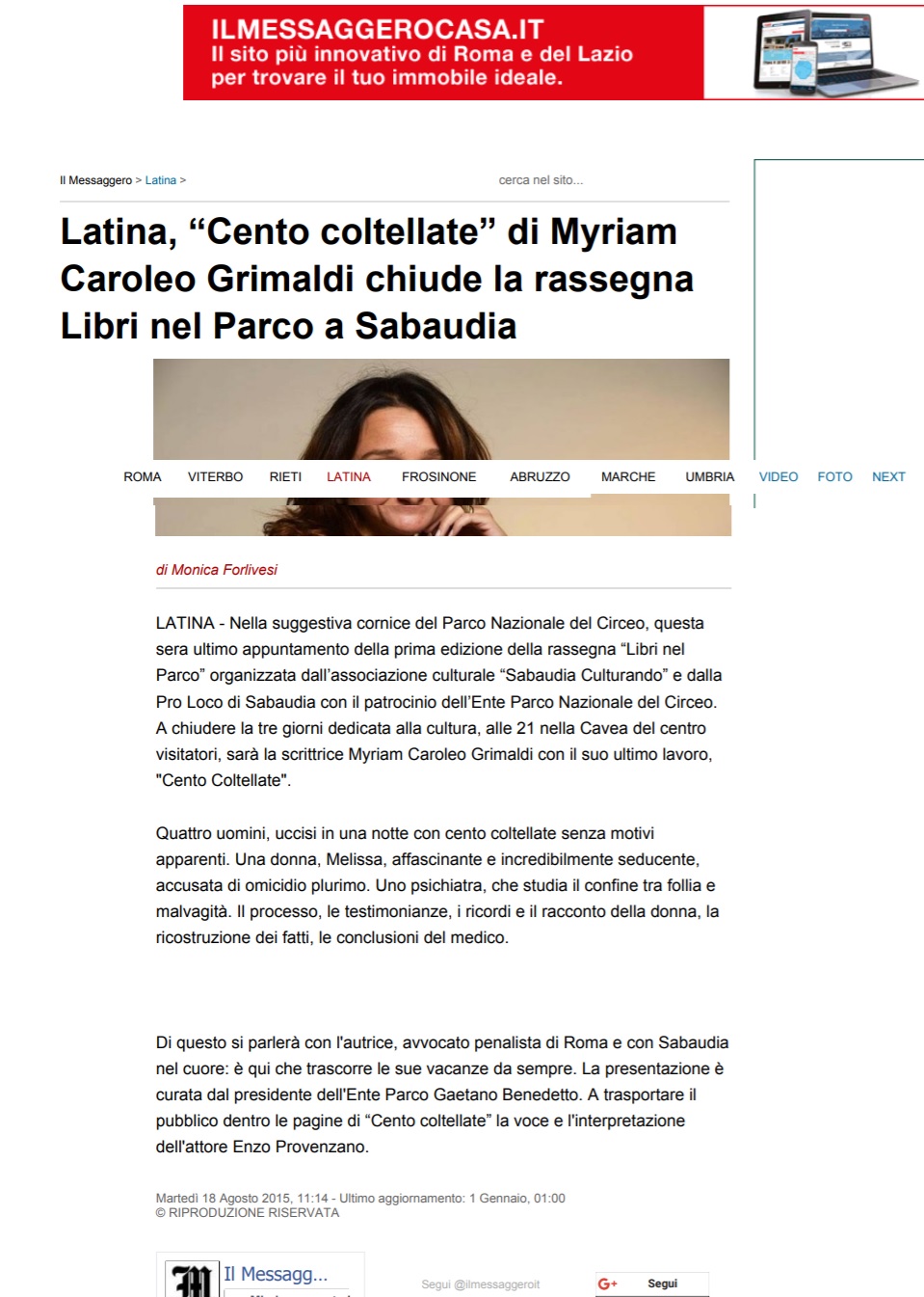 LATINA, CENTO COLTELLATE DI MYRIAM CAROLEO GRIMALDI CHIUDE LA RASSEGNA LIBRI NEL PARCO A SABAUDIA IL MESSAGGERO 18 AGOSTO 2015 Immagine 4 di 5